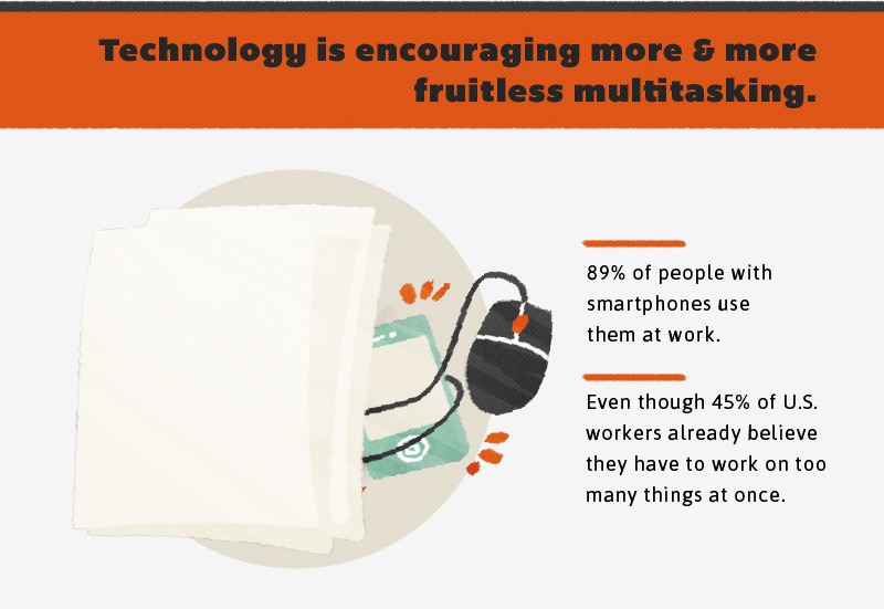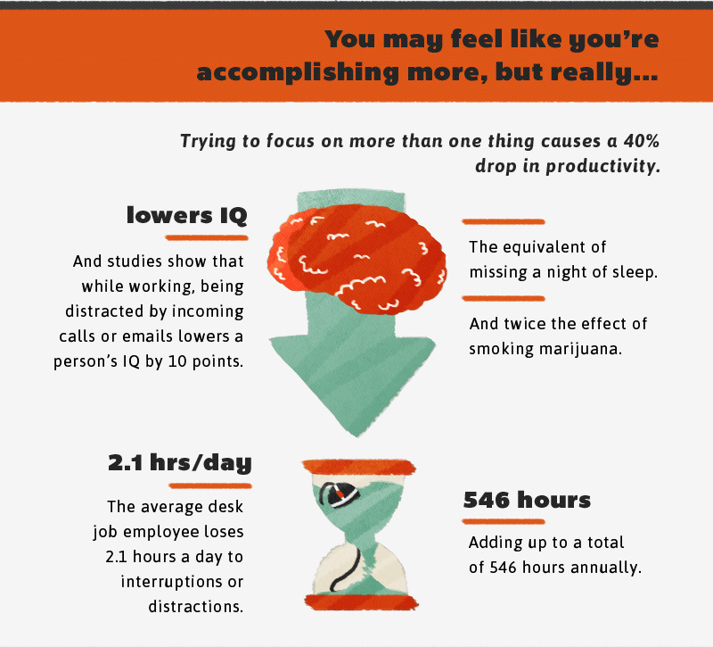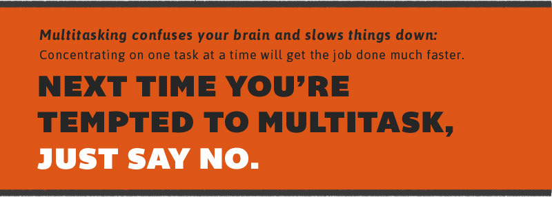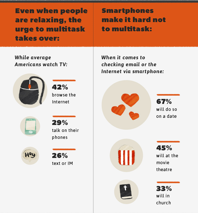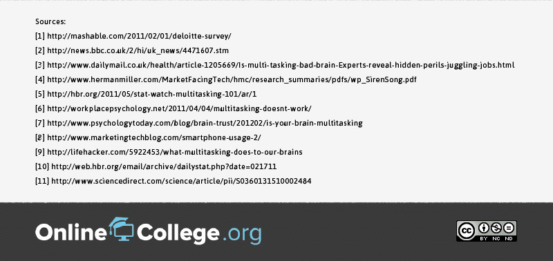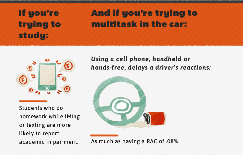 From maintaining a course-load with multiple subjects to completing various projects and papers all at one, every college student knows that there’s never just one thing to do at a time. If you’re the type of student who works on multiple assignments while simultaneously eating dinner and watching television, you’re not alone. Everybody multitasks, but what most people don’t realize is that, in fact, multitasking doesn’t work. Studies show that only about 2% of people are capable of effectively multitasking, but that doesn’t stop the remaining 98% of people from trying. And with today’s technology, everyone multitasks more than ever—from using smartphones in class to tablets while watching television, there are always multiple things to be doing at one time. While multitasking may make you feel like you’re accomplishing more things in less time, in actuality trying to multitask does more harm than good: It reduces productivity, and even lowers your IQ. Things like texting while studying or watching TV while working on a paper can have a huge effect on your academic success, so next time you’re tempted to multitask while doing schoolwork, remember that if you really want to get something done right, multitasking is probably not your best route.