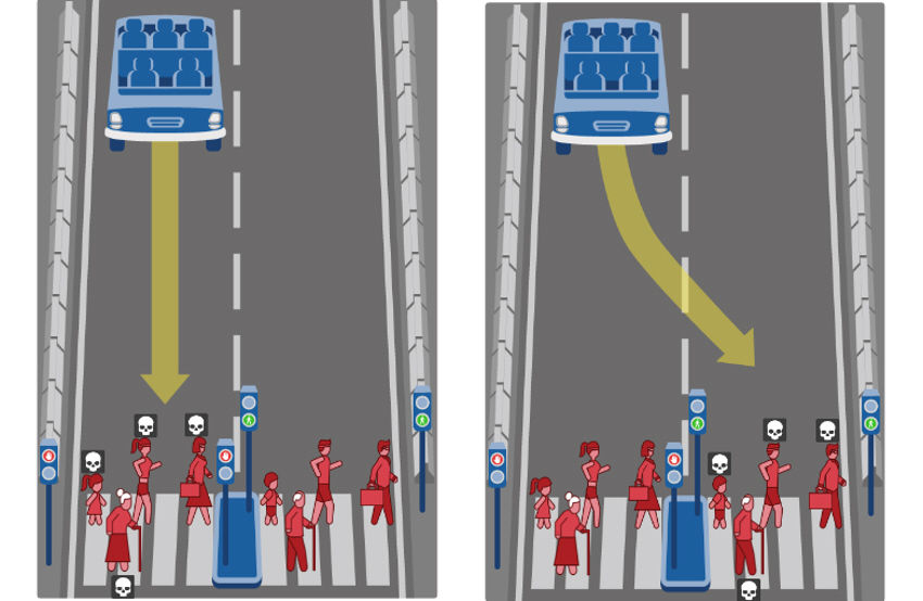 That’s the premise behind “Moral Machine,” a creation of Scalable Corporation for MIT Media Lab. People who participate are asked 13 questions, all with just two options. In every scenario, a self-driving car with sudden brake failure has to make a choice: continue ahead, running into whatever is in front, or swerve out of the way, hitting whatever is in the other lane. These are all variations on philosophy’s “Trolley Problem,” first formulated in the late 1960s and named a little bit later. The question: “is it more just to pull a lever, sending a trolley down a different track to kill one person, or to leave the trolley on its course, where it will kill five?” is an inherently moral problem, and slight variations can change greatly how people choose to answer.